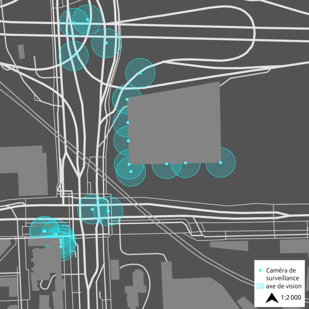 Position et axe de vision des caméras de surveillances autour de l’Adidas Aréna