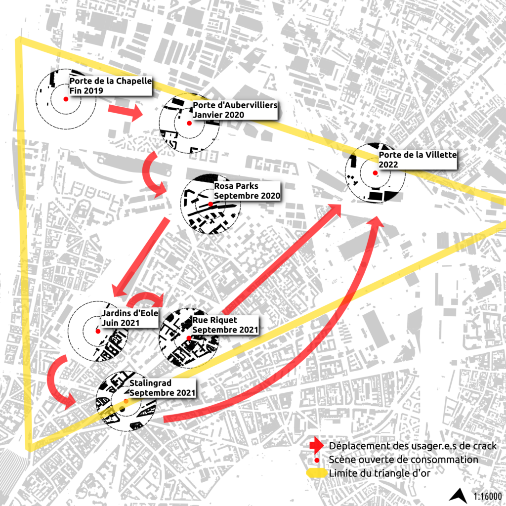 L’ensemble des méthodes que nous avons vues visant à expulser les usager.e.s du crack du quartier de Porte de la Chapelle incarnent une réponse sécuritaire à la question du crack et se contentent de repousser le problème hors du quartier. En effet, depuis la restructuration du quartier, des campements se sont formés puis ont été démantelés dans tout le Nord-Est parisien, entretenant une politique de harcèlement permanent des usager.e.s de crack, les repoussant jusqu’à l’épuisement et ce sans proposer de solution autre que le rejet constant vers d’autres lieux. Ainsi, le « problème » du crack n’est pas résolu mais la spéculation foncière peut d’ores et déjà reprendre son cours dans le quartier.